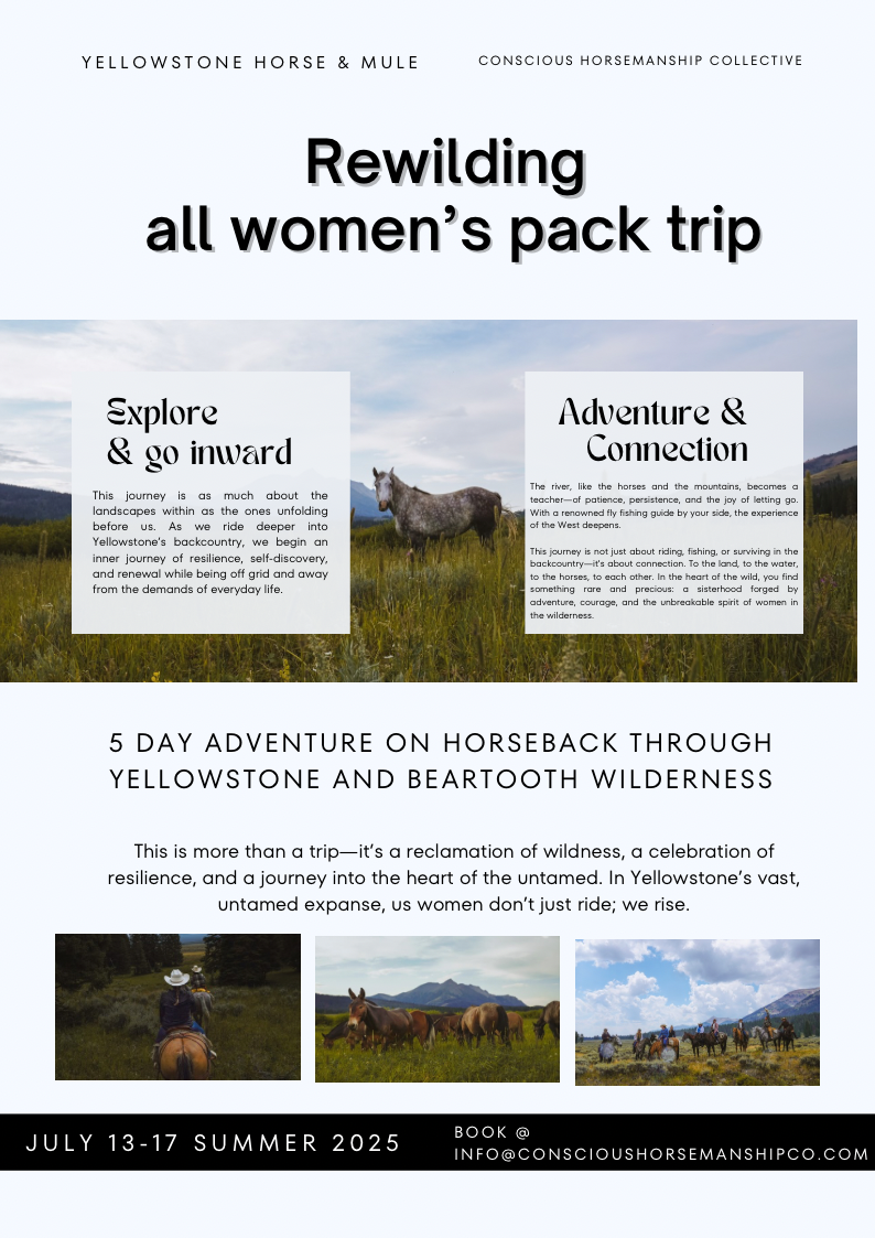Come ride with us on a Rewilding adventure for women 5 Day Pack Trip through Yellowstone National Park and the Beartooth Wilderness.